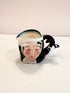 A delightfully whimsical vintage ceramic face mug depicting a rosy-cheeked colonial gentleman in a tricorn hat. Likely mid-century, this hand-painted piece features bold facial expression, curled wig detail, and rich glazing throughout. Perfect as a collectible, conversation piece, or quirky display item for lovers of folk art and historic character ware.